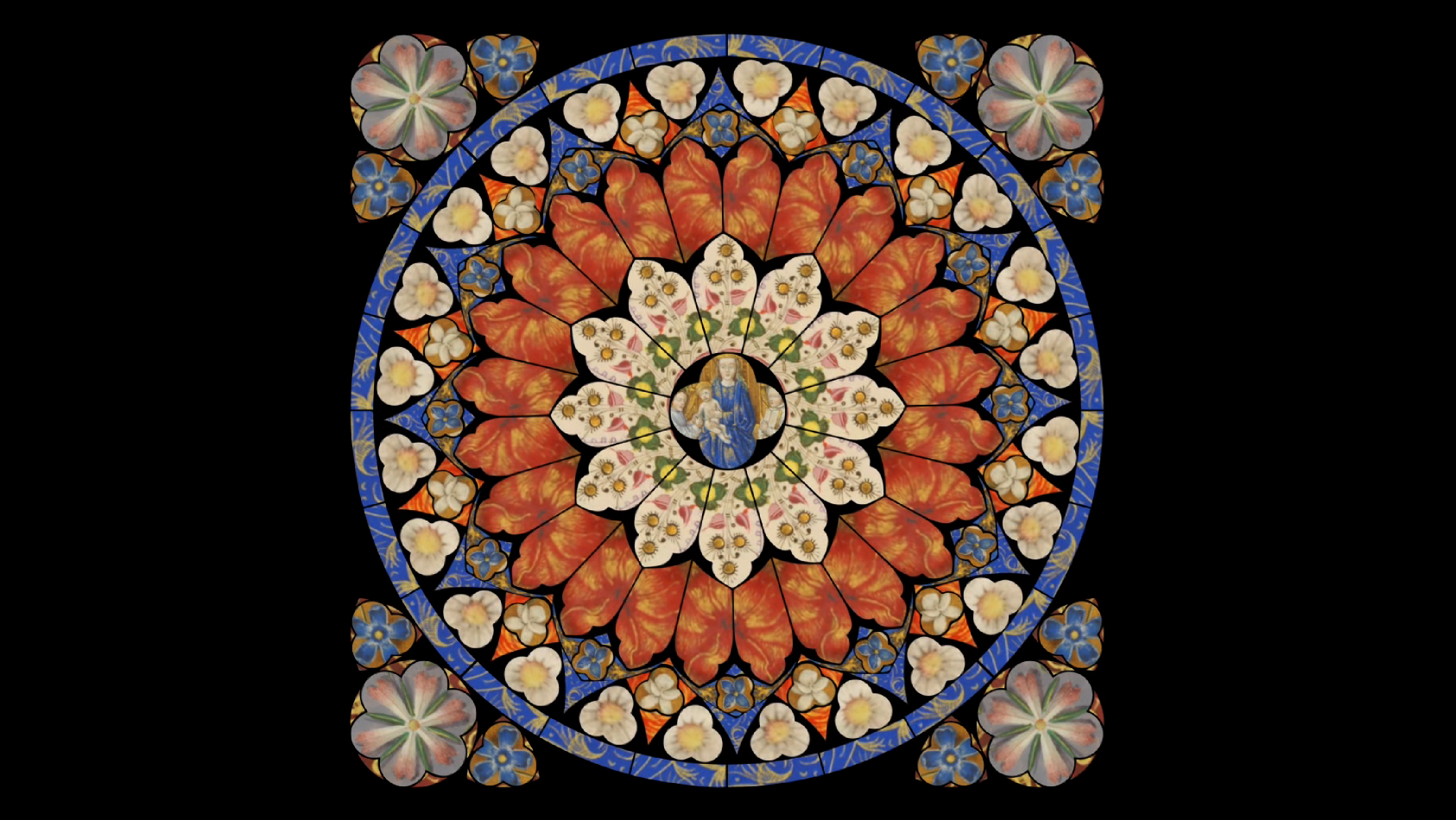 Visual elements from the Book of Hours arranged in a stained glass pattern, culminating in the coronation of the Virgin Mary